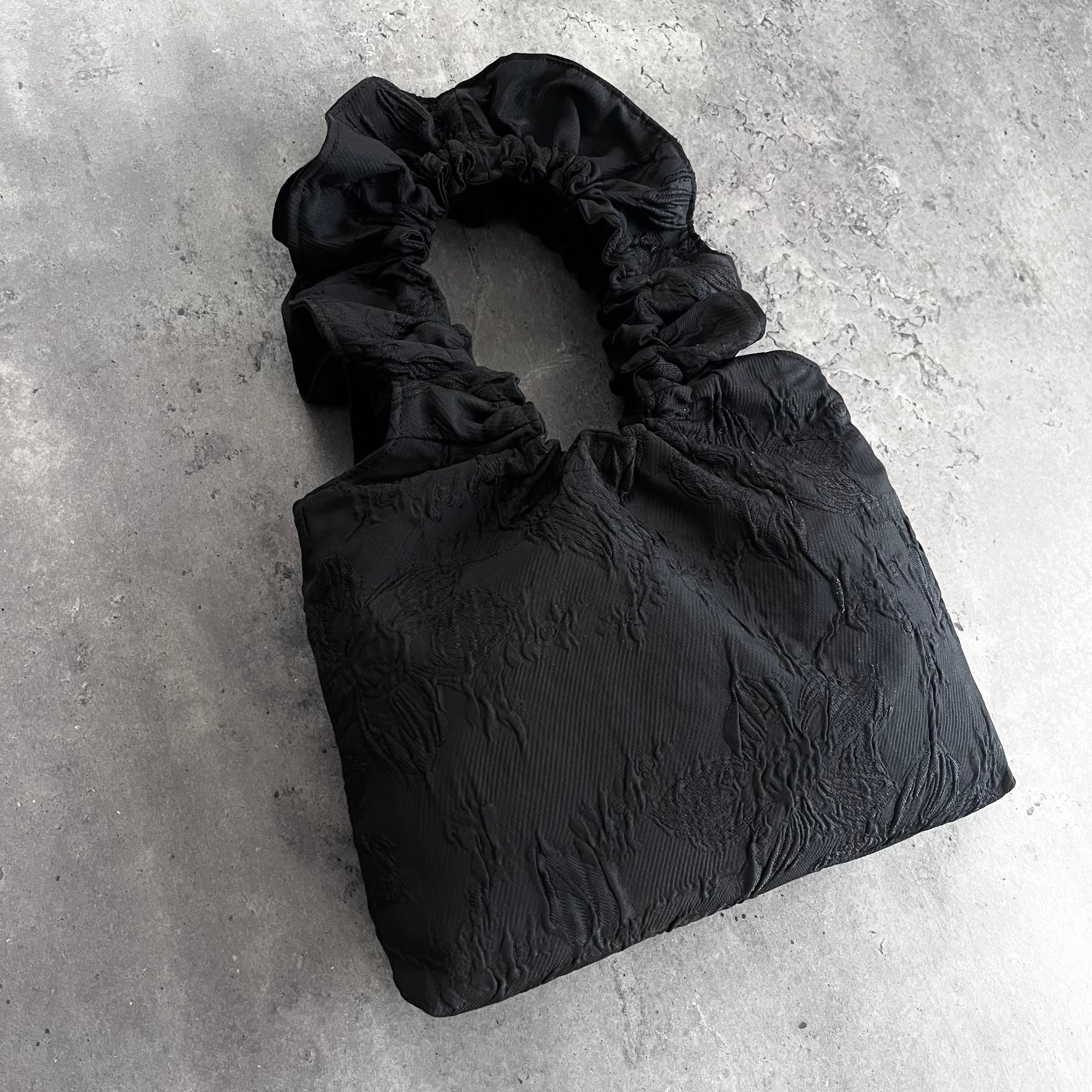 ブラックのエンボスフラワー生地とシーチングを使用したフリルのミニトート