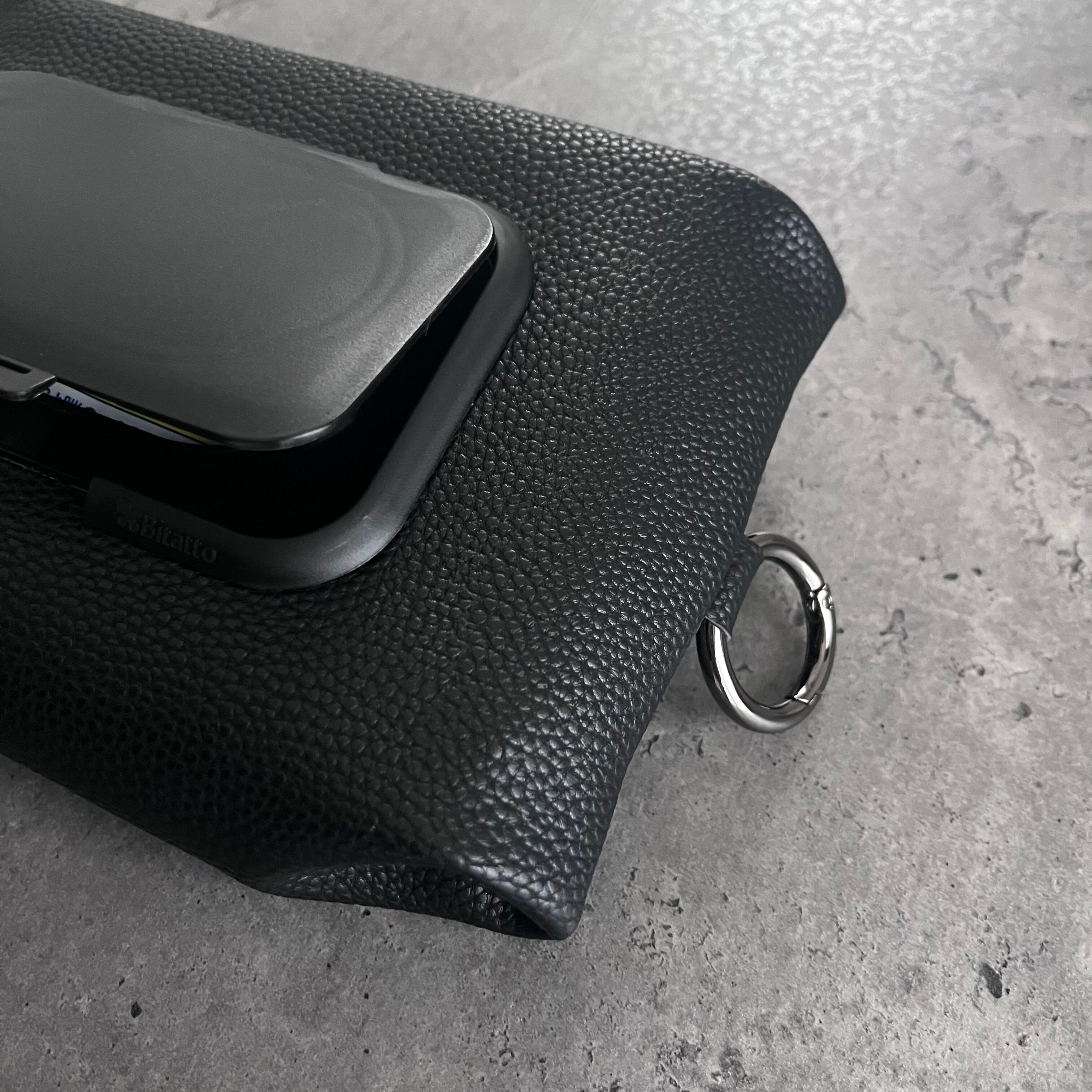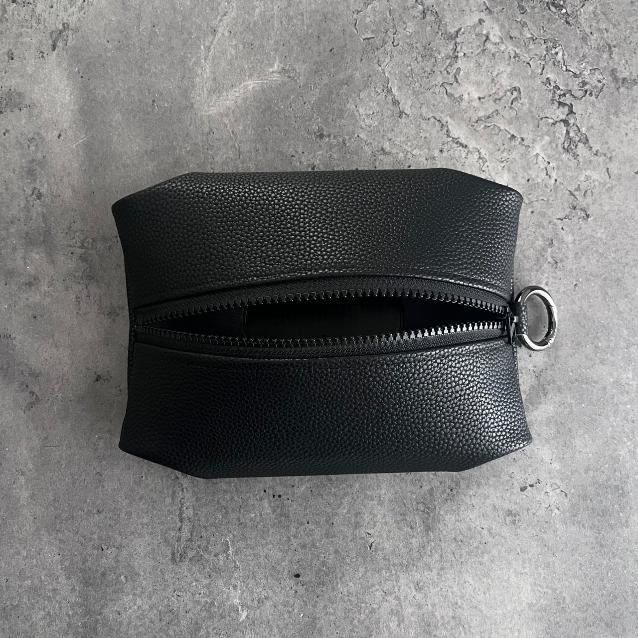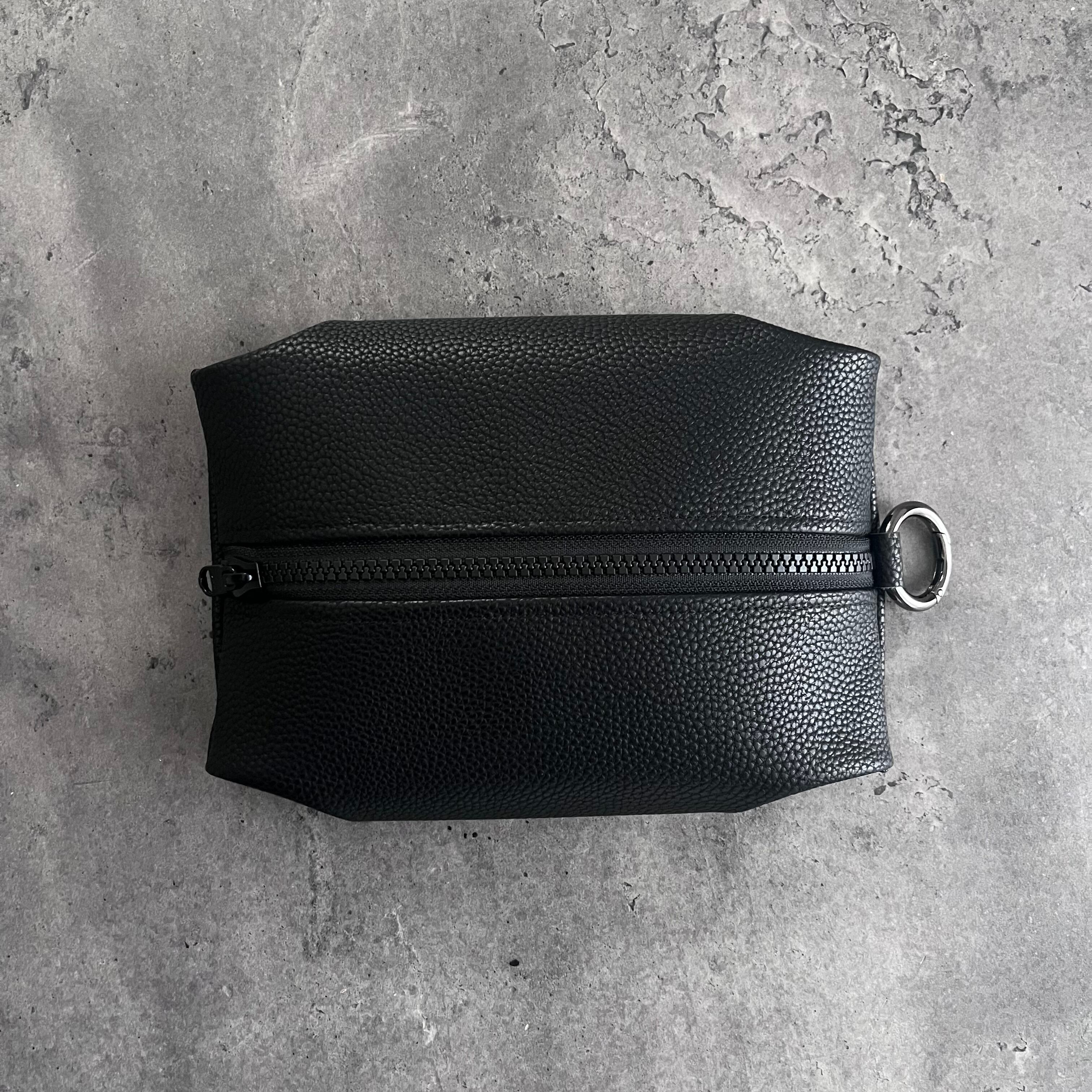 ファスナー、生地、カラビナ(黒ニッケル)すべてブラックで揃えて統一感を出しています